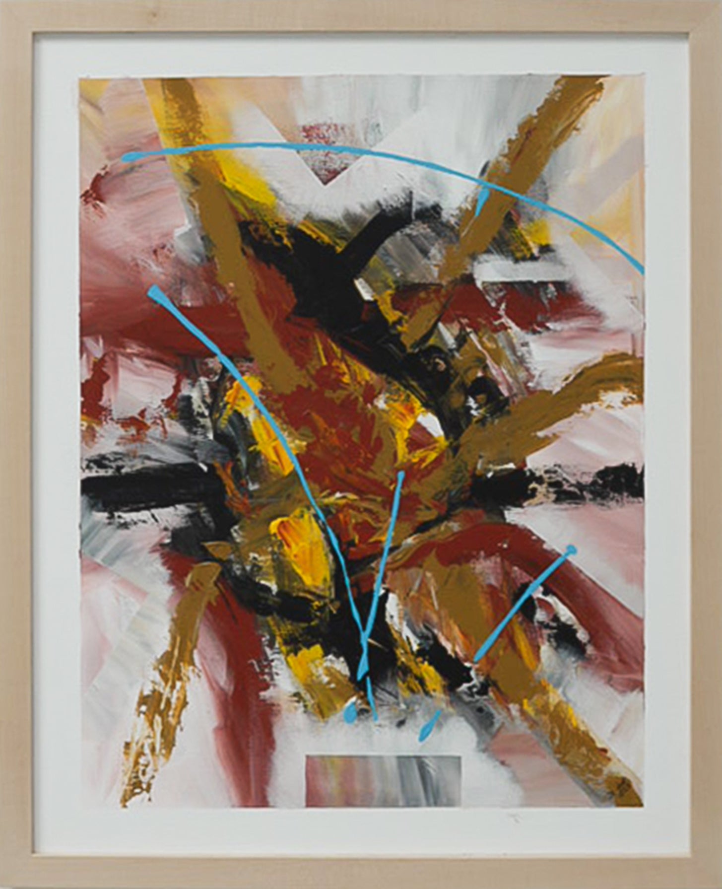 „Rechteck“ ist ein Werk voller Kontraste. Dynamische Strukturen in Braun, Schwarz und Rot brechen auf der Leinwand auseinander, durchzogen von hellen Flächen und leuchtenden Akzenten in Gelb. Darüber legen sich gezielt gesetzte Linien in strahlendem Blau, die wie Gegensätze wirken – streng, aber zugleich spielerisch.